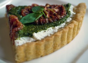 begin with a base of zesty pepper – parmesan crust. top it with a layer of light, fluffy chèvre from Bow, Washington’s Gothberg Farms. and then a layer of basil-pecan pesto. finally, a layer of gorgeous heirloom tomatoes, roasted low and slow in the oven. that’s the heirloom tomato tart. poetic, indeed.