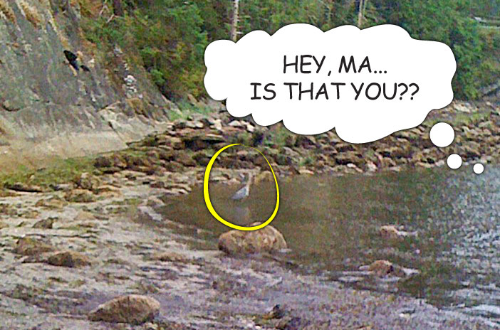 the early-morning fog hadn’t completely lifted. a brisk wind slapped the choppy water against the shoreline. the small, rocky beach spilled over with the empty orange shells of Dungeness crabs. i looked up toward the cove’s southern-most point and then i saw her standing in the shallow water: a great blue heron. seriously? compelled by the bird to take an unplanned jaunt to the park that morning and specifically to the cove? well, i like to think she was the beak-in. certainly made me feel like mom is never too far away. i didn’t have my camera with me, but Tootie managed to take a blurry shot with her phone’s camera. mom would never have passed up a photo op.